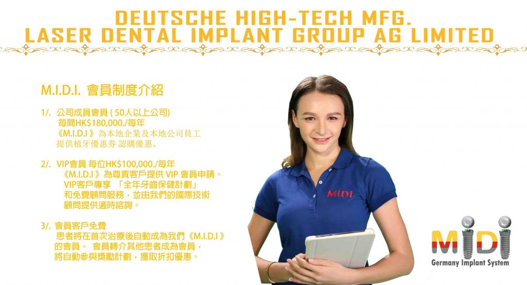 M.I.D.I . 為本地企業及本地公司員工提供植牙優惠券認購優惠。